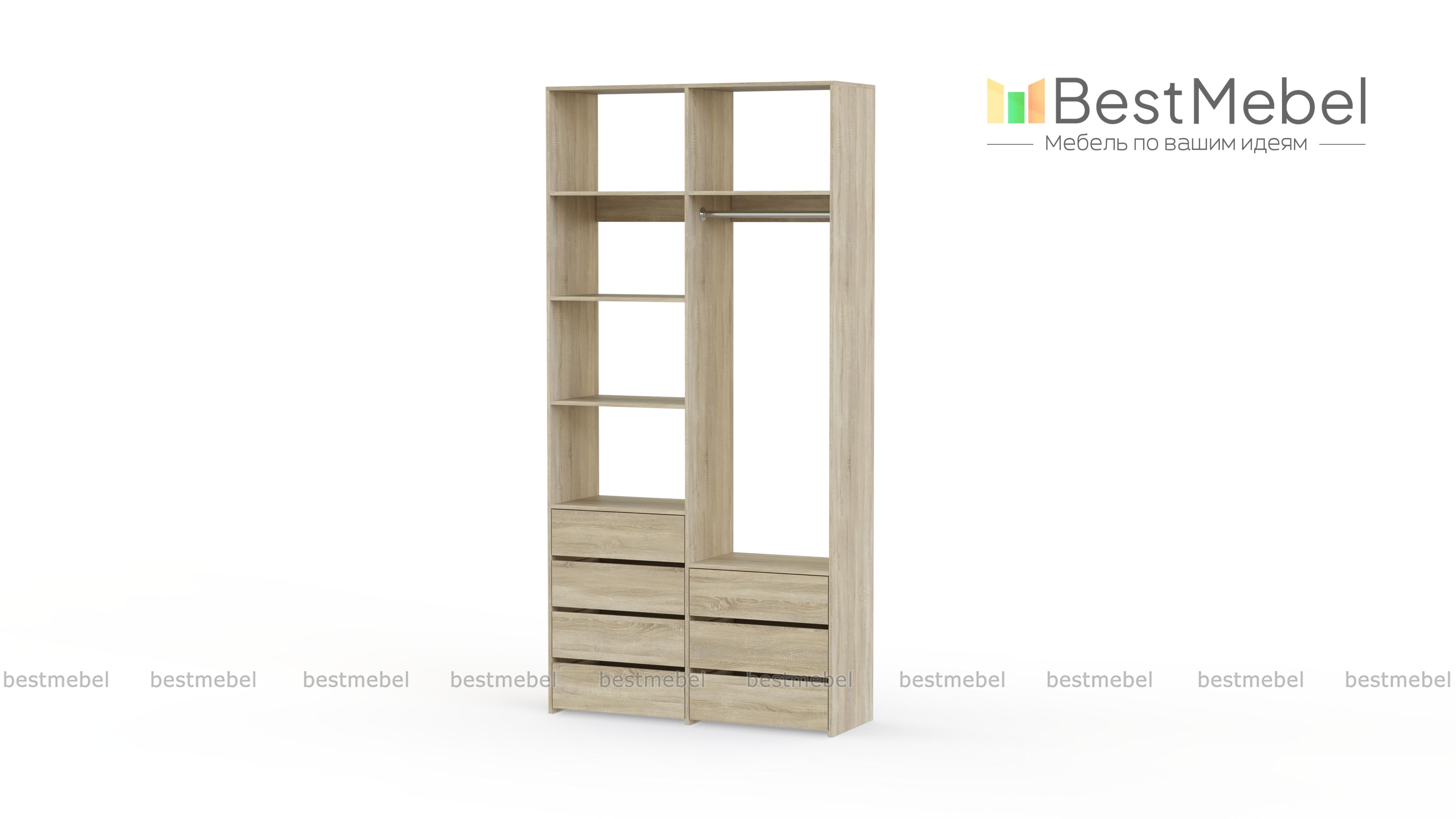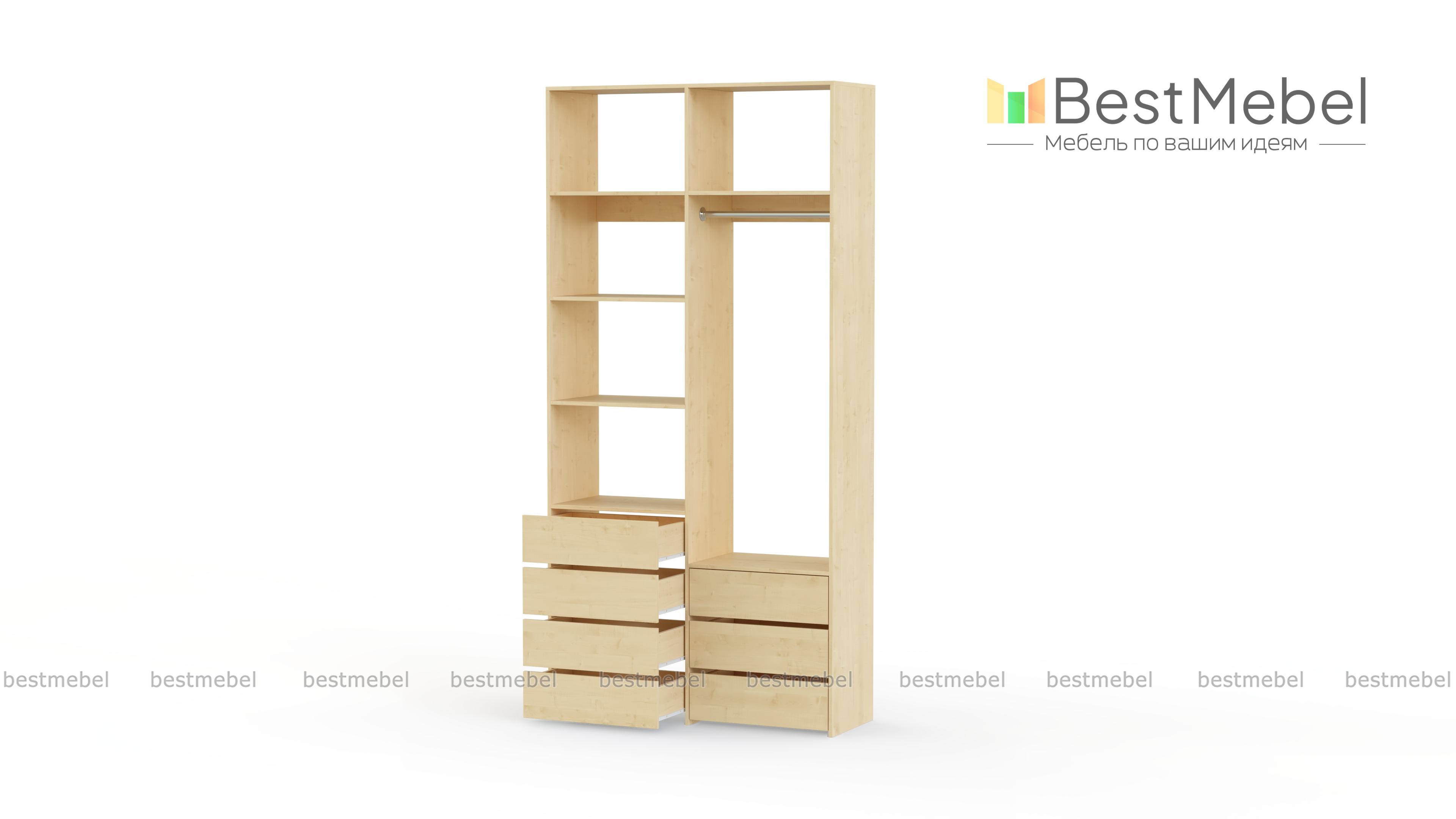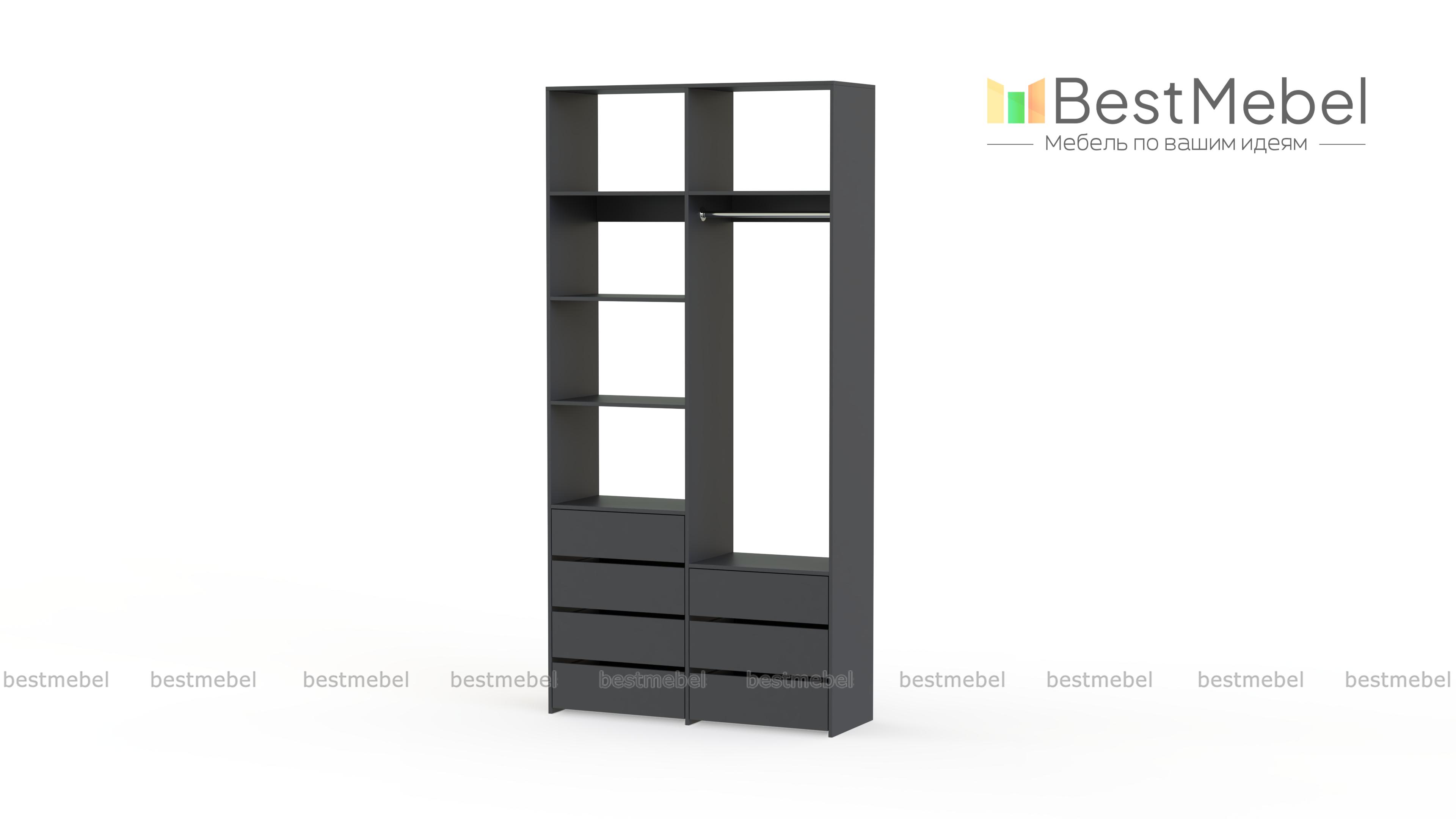 Стеллаж для одежды Мирта 41 BMS позволит вам зонировать пространство для хранения. Компактная двухсекционная конструкция разделена на отсек для вешалок, бельевые полки и два ряда выдвижных ящиков — под аксессуары, трикотаж и другие мелкие вещи. Для простого функционального дизайна стеллажа оптимально подходит светлый базовый оттенок. Купить стеллаж для одежды Мирта 41 BMS вы всегда сможете на сайте нашего интернет-магазина, по желанию изменив цвет и размеры.