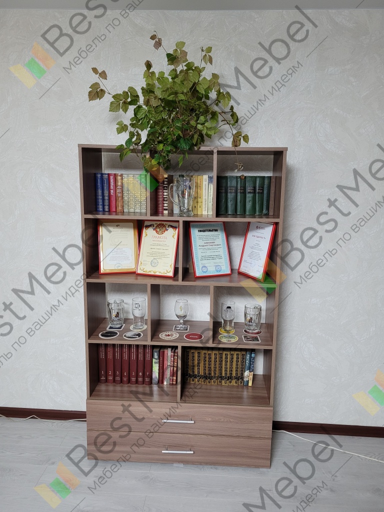 Стеллаж идеален, не под потолок, смотриться легко.Есть неглубокие ящики для бумаг и фотоальбомов.
