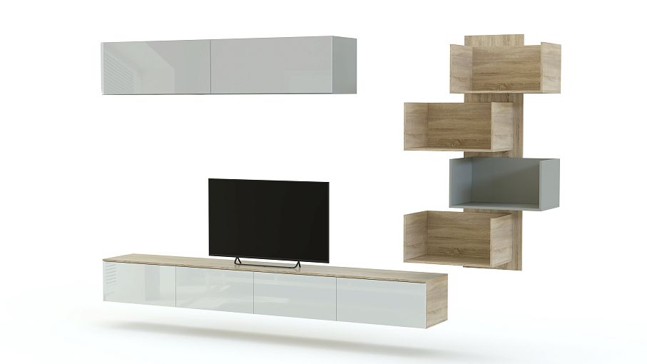Гостиная Дарк 15 BMS – визуально легкая и функциональная композиция для оформления зоны ТВ в интерьере современной квартиры. Подвесной модульный комплект включает в себя широкую тумбу с четырьмя выдвижными ящиками для мелочей, открытые книжные полки и горизонтальный шкаф с глухим фасадом. Поверхности светлого древесного оттенка и глянец дополнены яркими контрастными акцентами. Купить гостиную Дарк 15 BMS и создать комфортный интерьер вы сможете с помощью нашего интернет-магазина.