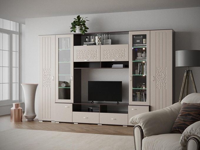 Гостиная Оскар мокко BMS изящно сочетает классическую декоративность и современные тенденции. Темный корпус в оттенке венге гармонично сочетается с нейтральными пастельными фасадами, украшенными фрезеровкой и ручками с кристаллами. Разнообразие входящих в комплект отделений позволит разместить все необходимое, от современного ТВ до посуды и интерьерных украшений. Два высоких бельевых пенала дополнены комбинацией из элегантных витрин, тумбы и навесной секции. Купить гостиную Оскар мокко BMS по лучшей цене вы сможете в нашем интернет-магазине.