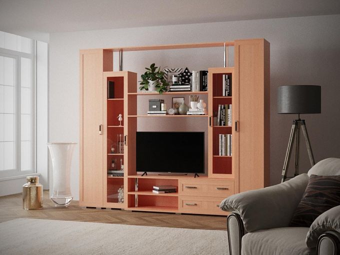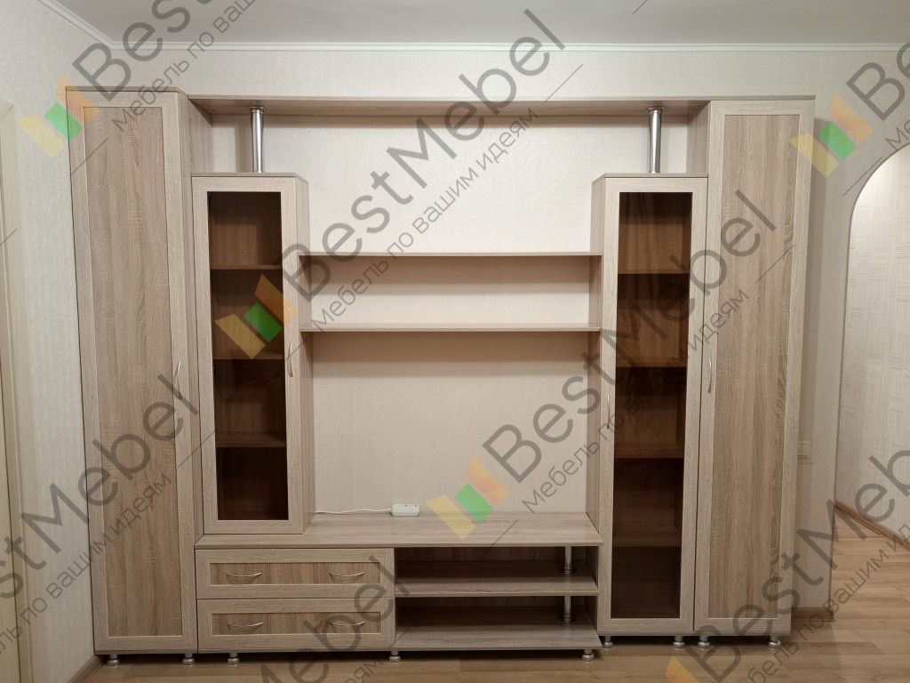 Отличная стенка! Сначала выбрал на сайте, потом заказал в демо-зале на Ярославке, куда принес с собой образцы обоев и ламината, чтобы подобрать подходящий цвет панелей мебели. Огромное спасибо сотруднице, принимавшей заказ! Она включила в заявку опорные ножки и ручки для дверей, которые не предлагались на сайте, но мне их очень хотелось :) Привезли через неделю. Сборка не очень простая, но и не безумно сложная. Собирать желательно вдвоем, потому что поставить верхнюю крышку в одиночку практически нереально. И две средние полки ставить одному тоже неудобно.Ну, а когда все собрано - выглядит как на приложенном фото.Рекомендую!