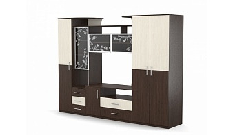 Стенка Рикардо 3 BMS – визуально легкая современная горка геометричного дизайна. В центре композиции располагается секция под ТВ с нишей, широкой тумбой, глухими и открытыми полками для книг и разнообразных мелочей, а по бокам – распашные шкафы для одежды и домашнего текстиля. В оформлении фасадов скомбинированы контрастные древесные тона и узкие зеркальные вставки с пескоструйным орнаментом. Купить стенку Рикардо 3 BMS по доступной цене вы сможете в нашем интернет-магазине.