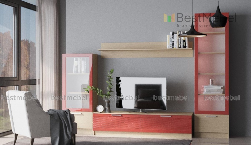 Стенка в гостиную Блеск 30.1-3D BMS – практичная модульная конструкция для современных интерьеров. Отдельные предметы вы сможете разместить по своему вкусу и гармонично вписать комплект в помещения любой планировки. Стенка включает в себя широкую низкую тумбу под ТВ, навесную открытую полку и две комбинированные витрины – большую и малую. Ярким акцентом в домашней меблировке станут цветные глянцевые фасады с 3D рисунком. Купить стенку в гостиную Блеск 30.1-3D BMS, эффектную и функциональную, приглашаем в наш интернет-магазин.