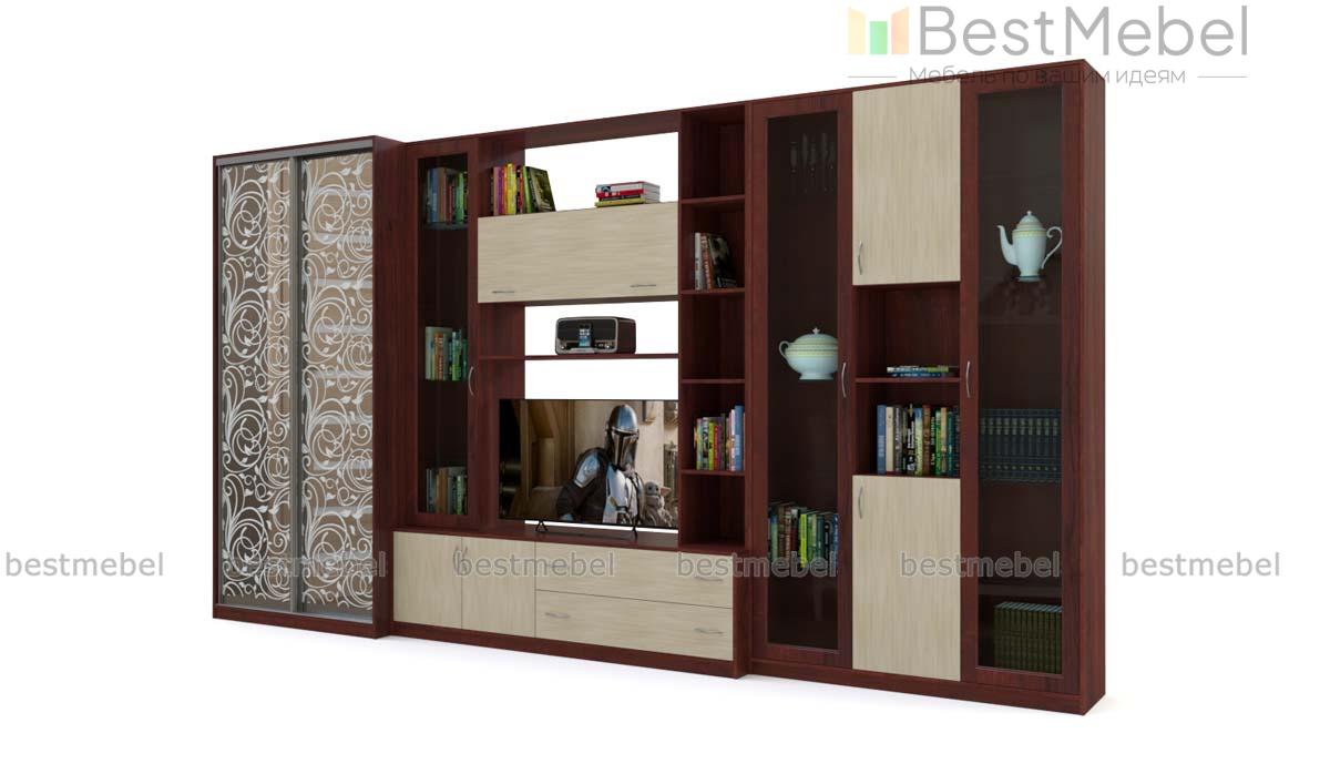Стенка в гостиную Локи 72 BMS отличается крупными габаритами, но не смотрится громоздко благодаря застекленным и открытым секциям. Продуманная система хранения включает в себя двухдверное отделение-купе для одежды, глухие распашные отделения, изящные посудные витрины, выдвижные ящики и ниши для предметов декора. Выполненная в коричнево-бежевой гамме, стенка декорирована по зеркальному фасаду шкафа пескоструйным рисунком. Купить стенку в гостиную Локи 72 BMS приглашаем выгодно в наш интернет-магазин.