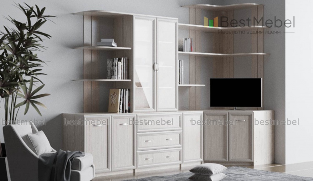 Угловая стенка Луна 85 BMS – визуально легкая, компактная композиция для небольшой гостиной или спальни в классическом стиле. В нижней части стенки располагаются распашные отделения и выдвижные ящики, удобные для хранения домашнего текстиля и бытовых мелочей, а верхняя представляет собой надстройку из элегантной витрины и открытых полок со скругленными углами для книг и декоративных предметов. Рамочные фасады выполнены в светлых древесных тонах. Купить угловую стенку Луна 85 BMS приглашаем в наш интернет-магазин по демократичной цене.