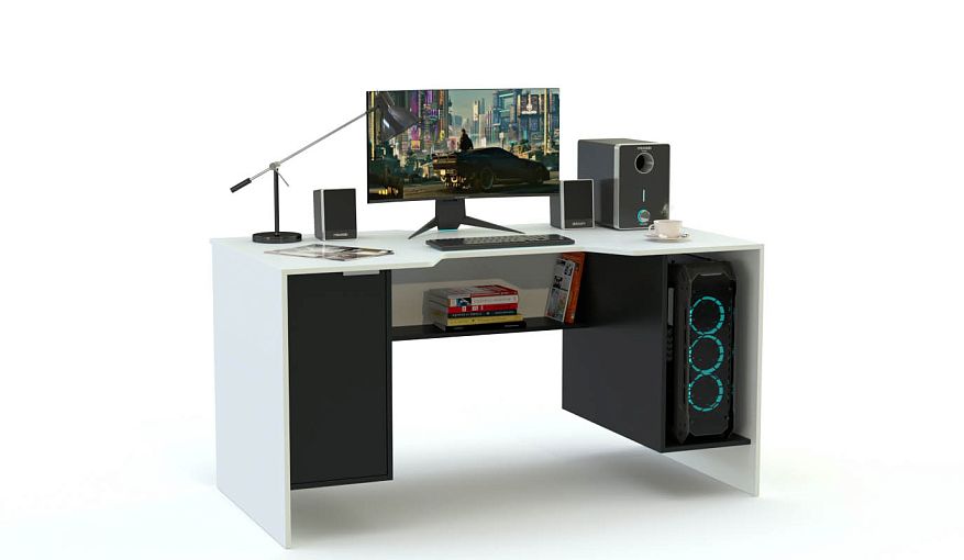 Геймерский стол Страйк 5 BMS поможет компактно разместить необходимую технику и рабочие материалы. Прямая модель оборудована просторной столешницей с эргономичным вырезом и выемкой под провода, под которой располагаются открытая книжная полка и две подвесные тумбы – открытая для системного блока и глухая распашная. Контрастное цветовое решение подчеркивает современный дизайн стола. Купить геймерский стол Страйк 5 BMS для игры, работы или учебы вы сможете в нашем интернет-магазине.