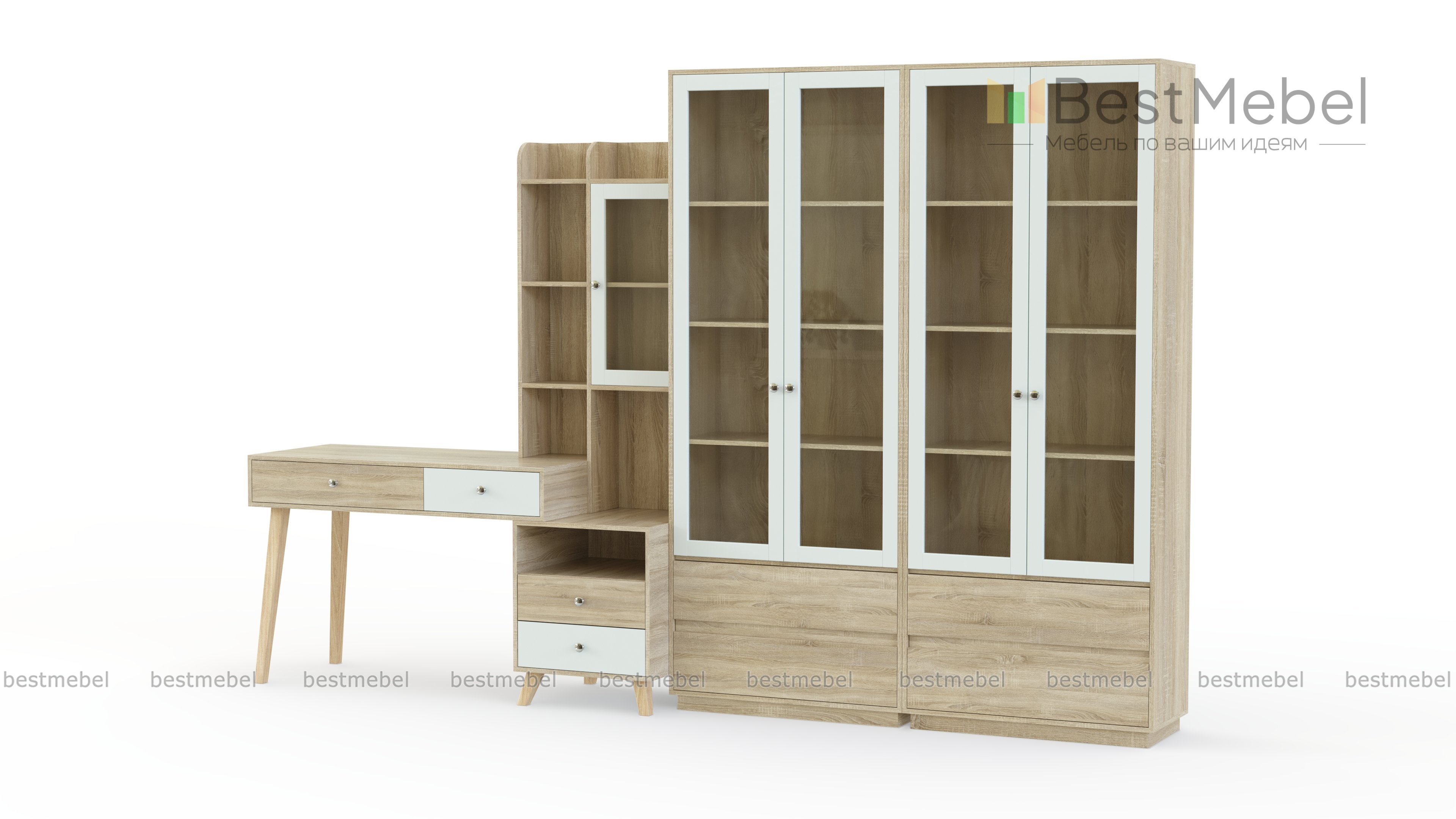 Компьютерный стол Марио 13 BMS выполнен в светлых древесных тонах и гармонично дополнит современные интерьеры с элементами скандинавского стиля. Модульная композиция для молодежной комнаты или кабинета включает в себя два книжных шкафа со стеклянными дверцами и выдвижными ящиками в основании, комбинированный с тумбой стеллаж и приставной компьютерный столик на высоких опорах. Купить компьютерный стол Марио 13 BMS и разместить в зоне быстрого доступа все необходимые для работы или учебы материалы вам поможет наш интернет-магазин.