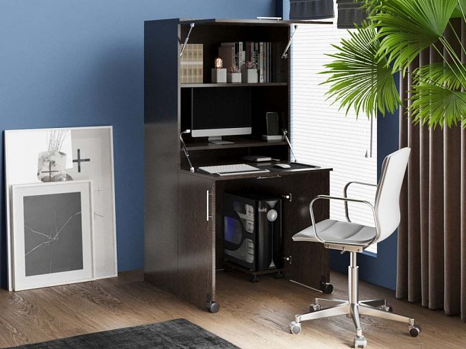 Стол СМ 02. 01 поможет Вам сэкономить пространство в комнате, благодаря своей конструкции. В собранном виде эта модель выглядит как небольшой шкаф, но пару движений и перед Вами рабочее место. Стол расположен на мебельных роликах, что обеспечит легкое перемещение. Изделие вмещает в себя нишу для монитора, столешницу, место для системного блока. Также имеются полки для книг или документов. Для гармонии с другой мебелью Вы можете выбирать цвет и размеры, подходящие именно под комнату. Купить стол можно у нас на сайте.