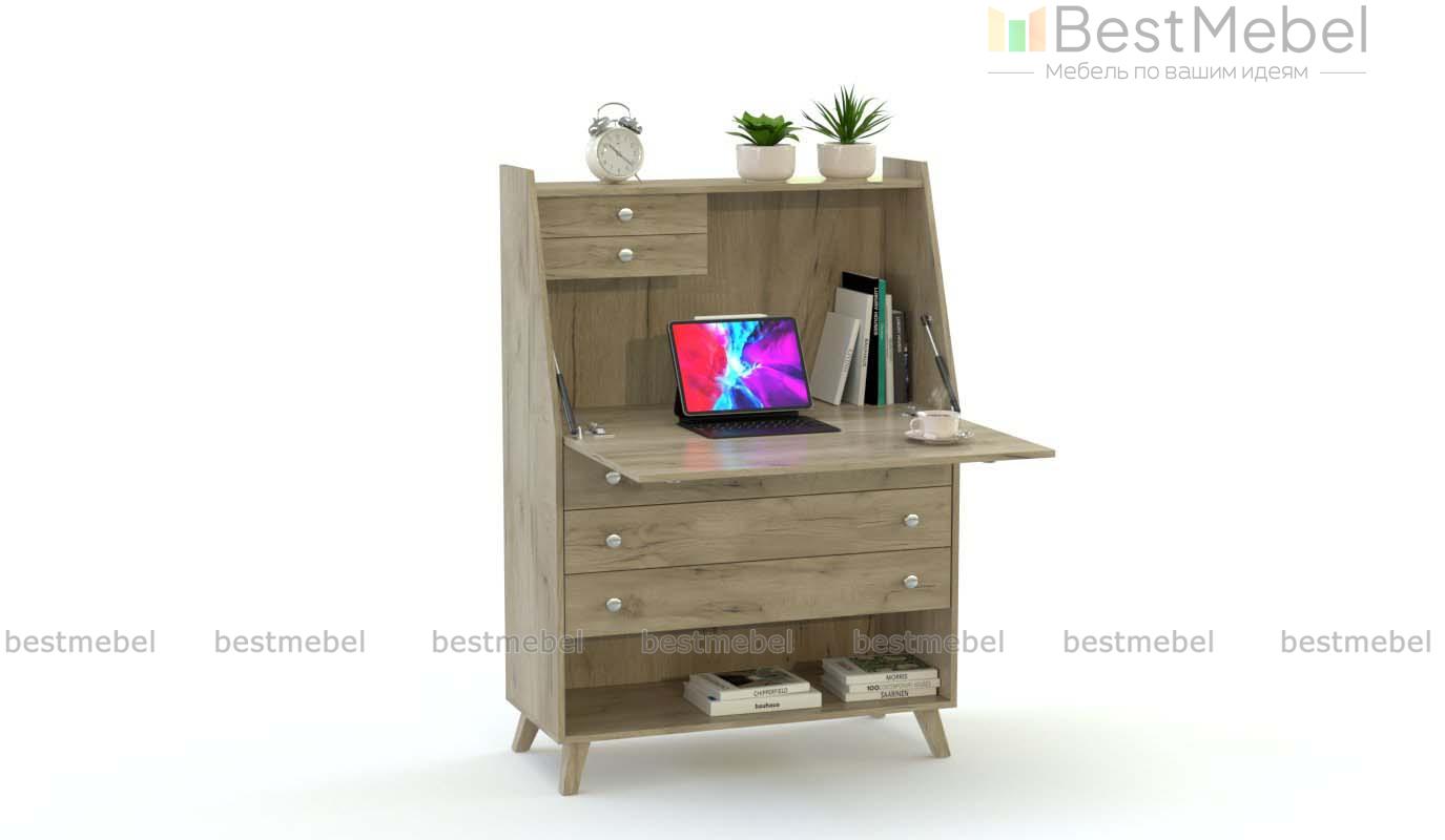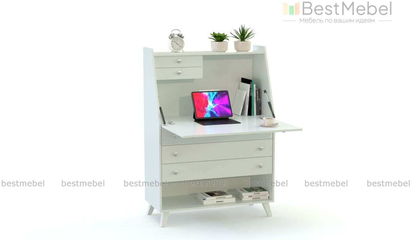Компьютерный стол-трансформер Эльма 3 BMS выполнен в светлых ванильных тонах и располагается на высоких скошенных ножках. Миниатюрный секретер легко впишется в интерьер современной спальни или гостиной, при необходимости превращаясь в удобный для работы за ноутбуком стол. Для хранения в зоне быстрого доступа рабочих материалов конструкцией предусмотрены три выдвижных ящика и открытая секция, а верхняя полка подходит для размещения интерьерных украшений. Купить компьютерный стол-трансформер Эльма 3 BMS с возможностью выбора цвета приглашаем в наш интернет-магазин.