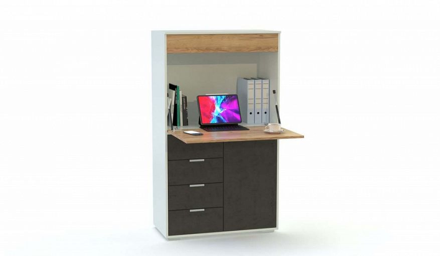 Компьютерный стол-трансформер Финн 1 BMS отличается компактными размерами в сложенном виде и внешне не отличается от шкафа. Трансформер с четырьмя вместительными выдвижными ящиками и распашным отделением, выполненный в сочетании древесных тонов и имитации поверхности камня, может использоваться для хранения рабочих материалов и канцелярских мелочей. При помощи откидной столешницы вы легко получаете комфортное рабочее место. Купить компьютерный стол-трансформер Финн 1 BMS вы сможете выгодно в нашем интернет-магазине.