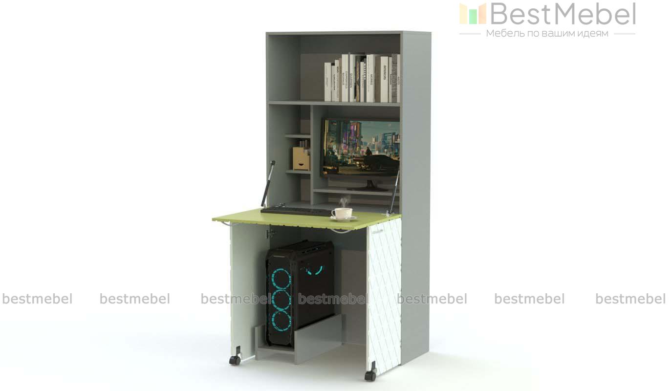 Компьютерный стол-трансформер Ольви 3 BMS украсит современный интерьер и сэкономит полезную площадь. Корпус, выполненный в теплых крафтовых тонах, скомбинирован с фрезерованным ромбами цветным фасадом. Трансформер оборудован просторной книжной полкой в верхней части, откидной столешницей, за которой скрыты ниша под монитор и стеллаж, опорными створками на колесиках и подставкой под системный блок. Купить компьютерный стол-трансформер Ольви 3 BMS для яркого и функционального интерьера вы сможете в нашем интернет-магазине.
