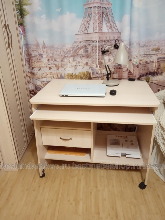 Очень удобный и функциональный столик на колесиках, легкий, мобильный. Размеры заказала по своим параметрам, поэтому он поместился именно там, где я хотела. Собирается легко (по сземе), но с установкой выдвижного ящичка возникли небольшие проблемы — схема на установку направляющих полозьев не приложена и пришлось искать ее в интернете.