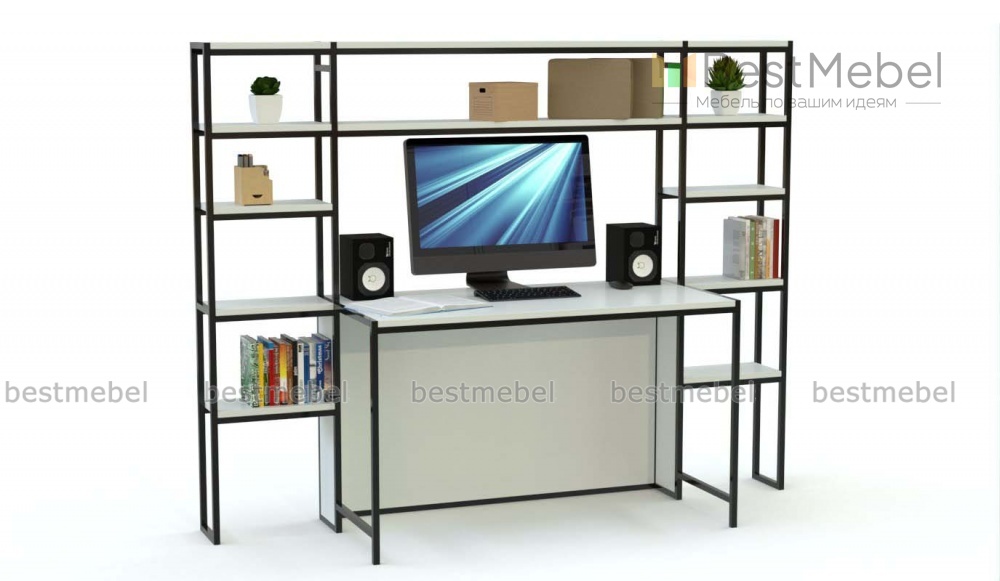 Стол компьютерный Ирис 3 BMS – это настоящий мини-офис с надстройкой и двумя боковыми стеллажами. Практичная открытая конструкция позволит разместить в быстром доступе книги и папки, оргтехнику и канцелярские принадлежности, делая рабочий процесс максимально комфортным. Модель с металлическим каркасом, выполненная в универсальном белом цвете, прекрасно вписывается в лофты, интерьеры стиля минимализм и индастриал. Купить стол компьютерный Ирис 3 BMS для меблировки дома или офиса вы сможете в нашем интернет-магазине.
