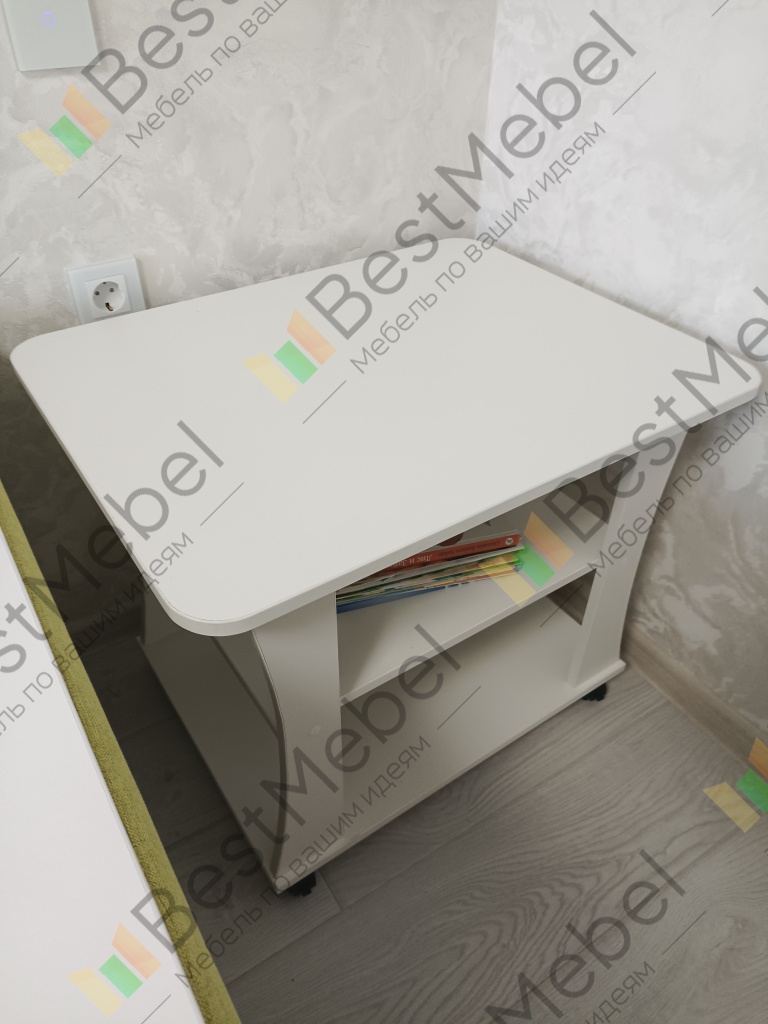 Заказ 00000889903Столик отлично подошёл в угол комнаты рядом с диваном. Покупали специально, чтоб ставить на него ёлку на праздник. Углы столика закруглены, так что ни ребенок ни взрослый не ударится об угол. На нижних полках можно складывать книжки, журналы, игры. Столик на колесиках, так что его может передвинуть даже ребенок, чтоб порисовать сидя перед телевизором. Очень удобно, что на сайте магазина можно выбрать цвет. Мы выбирали под цвет деталей дивана, который мы также заказывали на Бестмебель.