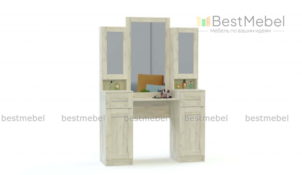 Туалетный стол Гаурон №1.1 BMS благодаря продуманной и вместительной конструкции поможет расположить максимальное количество всех необходимых уходовых средств, косметики и других предметов первой необходимости в одном месте. За двумя зеркальными фасадами скрыты отделения с полками, а сами распашные отделения позволяют использовать модель как трюмо. Изделие оборудовано двумя выдвижными ящиками для хранения мелочей и двумя распашными отделениями с глухими фасадами. Износостойкие и долговечные материалы сохранят эстетичный вид модели на долгое время использования. Купить туалетный стол Гаурон №1.1 BMS, подобрав необходимые размеры, приглашаем в наш интернет-магазин.