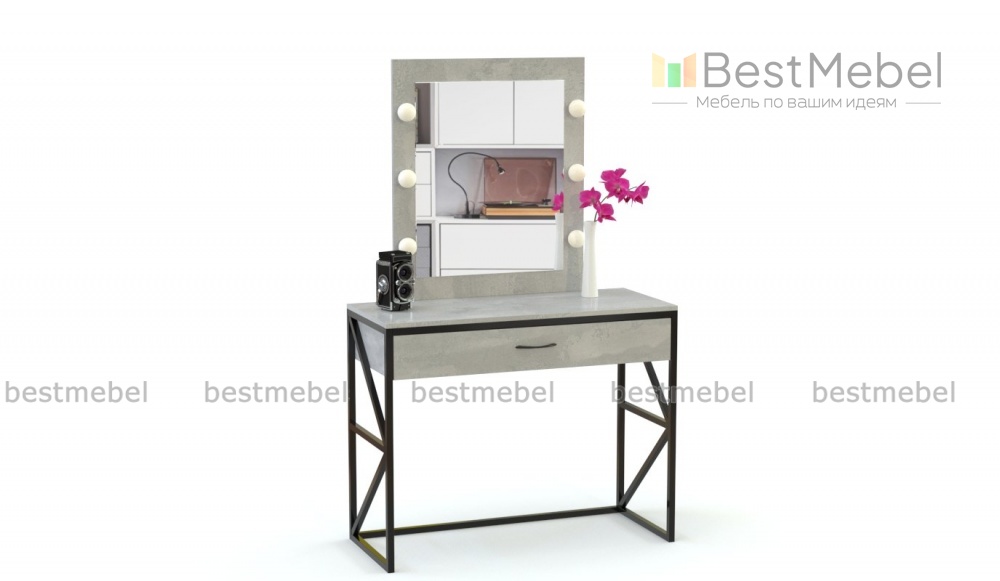 Туалетный стол Кино 12 BMS – это элегантная модель в индустриальном стиле. Выполненный из ЛДСП с имитацией поверхности бетона, макияжный столик располагается на прочном металлическом каркасе с фигурными боковинами. Для комфортного ухода за собой, хранения косметики и аксессуаров модель оборудована вместительным выдвижным ящиком и зеркалом со встроенной по бокам подсветкой. Купить туалетный стол Кино 12 BMS приглашаем в наш интернет-магазин с возможностью выбора цвета и размеров.