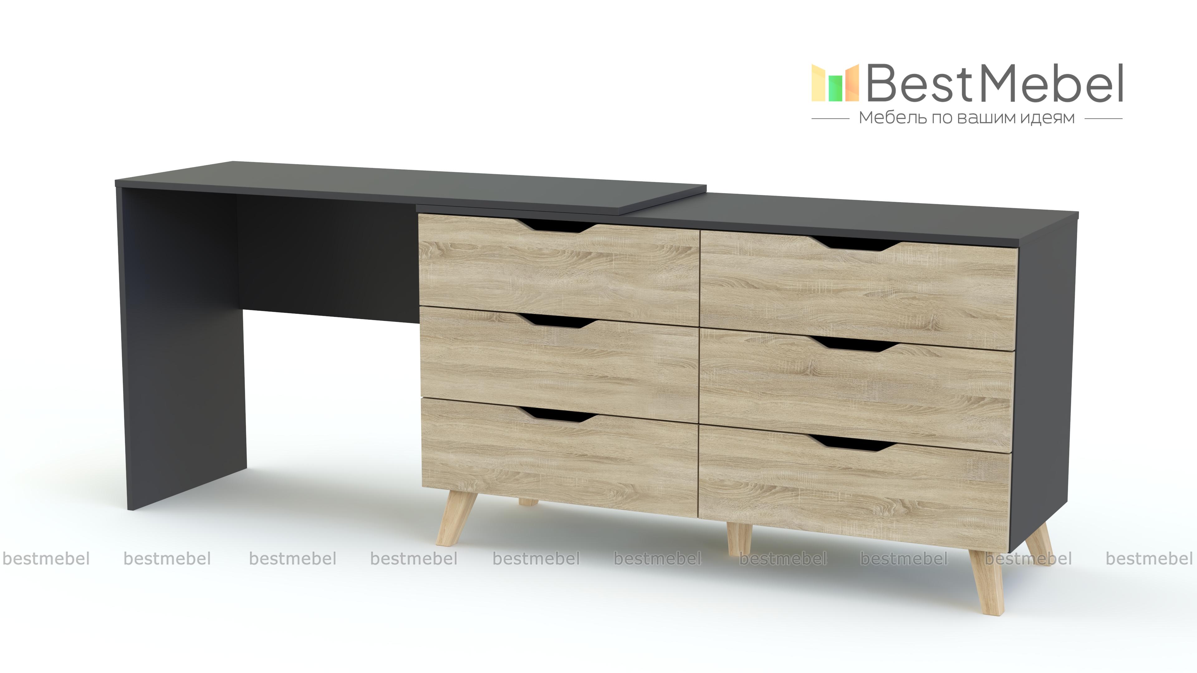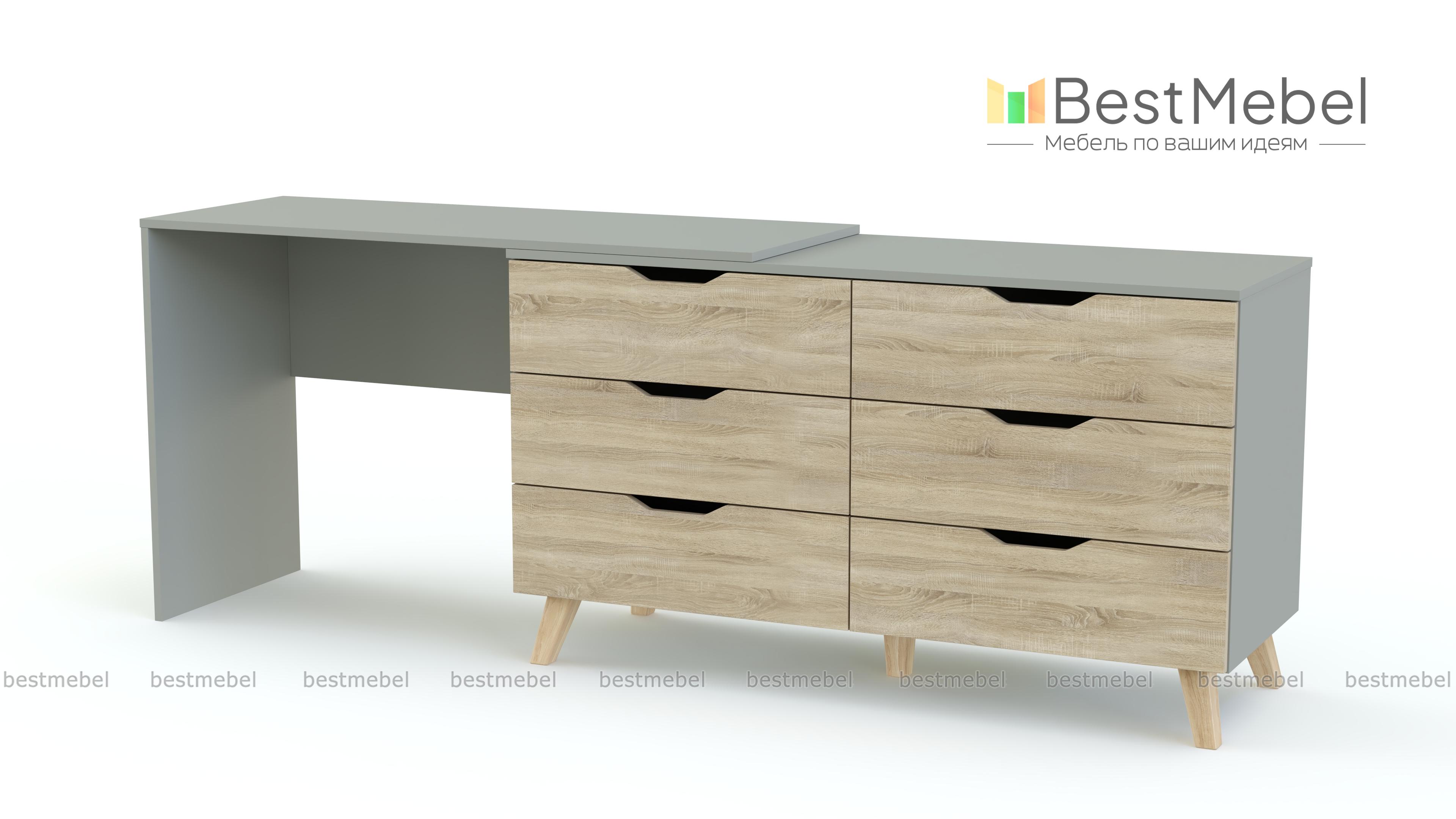 Туалетный столик Адам BMS – это многофункциональная модель, которую вы сможете использовать не только для хранения постельного белья, аксессуаров и разнообразных мелочей, но и для ухода за собой или работы за ноутбуком. Лаконичный комод в скандинавском стиле оборудован шестью выдвижными ящиками с ручками-вырезами, высокими скошенными ножками и совмещен со столом. Купить туалетный столик Адам BMS, выполненный в сочетании древесных тонов и белого, приглашаем в наш интернет-магазин.