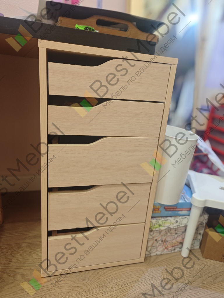 в этом заказе всё индивидуально: глянцевый корпус, в т.ч. задняя стенка, скрытые крепежи, шариковые направляющие с доводчиком, фотопечать, материал мдф. Получилось мощно! Мы довольны. Выполняет функцию разделителя под детским столом.