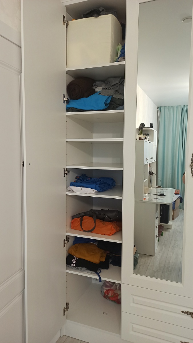 Шкаф покупали в прошлом году. Оформили в мебельном магазине лично. Мы внесли свои коррективы. Все ок. Когда доставили обнаружили, что положили разные ручки для дверей. Попросили заменить. Привезли на следующий день, но снова не такие. Решили уже забыть. (Брючницу на фото уже докупали сами)